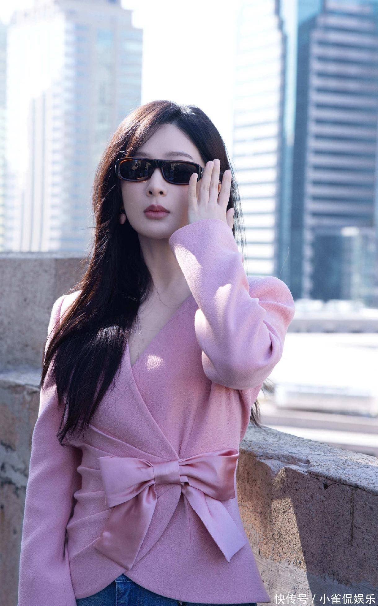当天杨紫穿了一件粉色V领收腰西装,胸前还点缀着缎面蝴蝶结,又甜又利落。