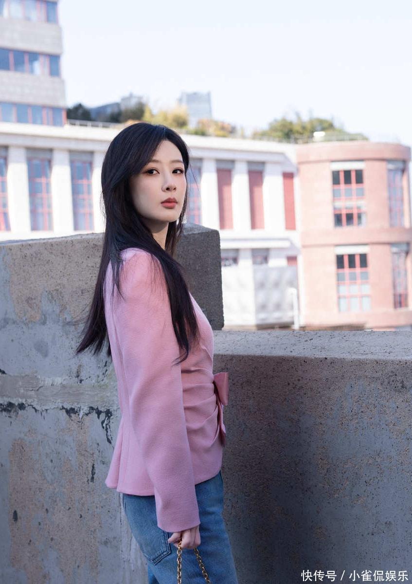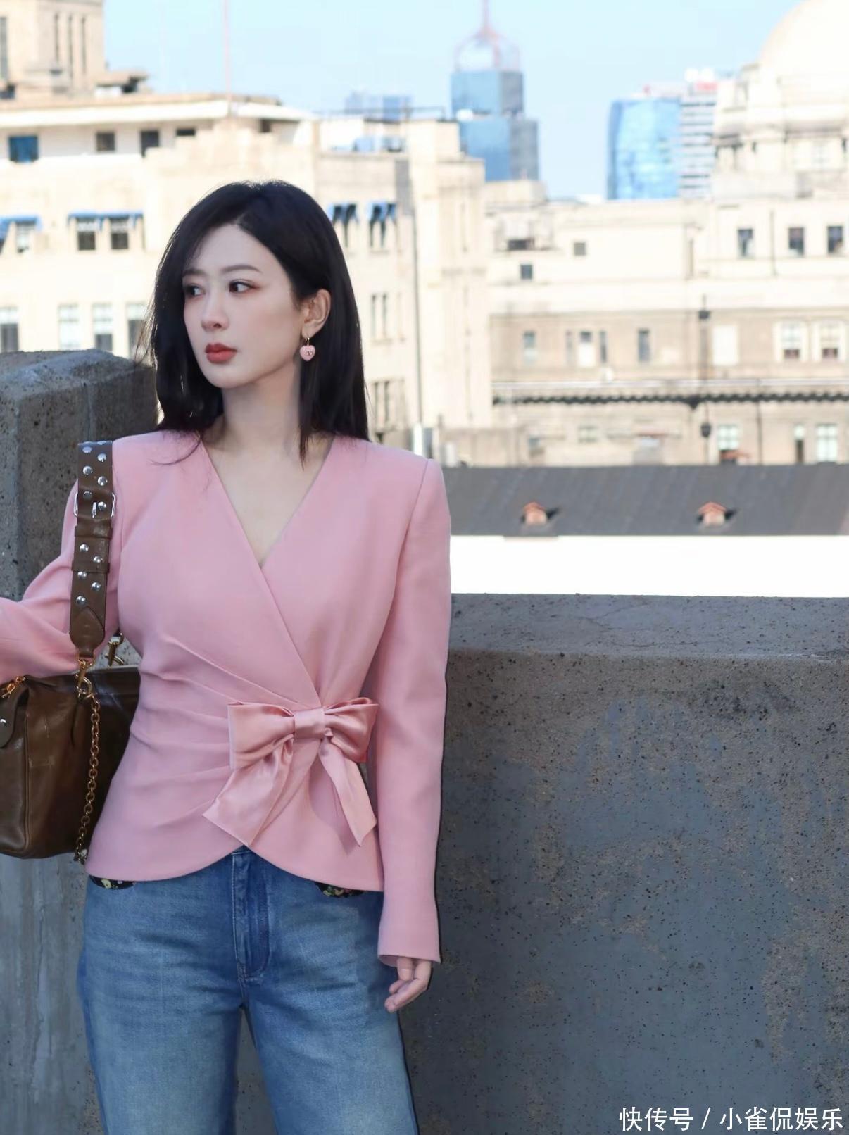 这套出发造型选得挺有心机——柔粉色显嫩又不轻浮,收腰剪裁把腰线勾勒得恰到好处,牛仔裤又压住了西装的正式感,不至于太隆重。